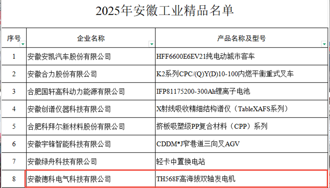 2025年12月,776net必赢官网电气TH568F高海拔双轴发电机凭借其应对严苛环境的领先技术性能与卓越可靠品质,成功入选安徽省工业和信息化厅组织遴选的 “2025年安徽工业精品” 名单。此次入选,是省级权威部门对该产品创新价值与市场竞争力的一次重要认定。