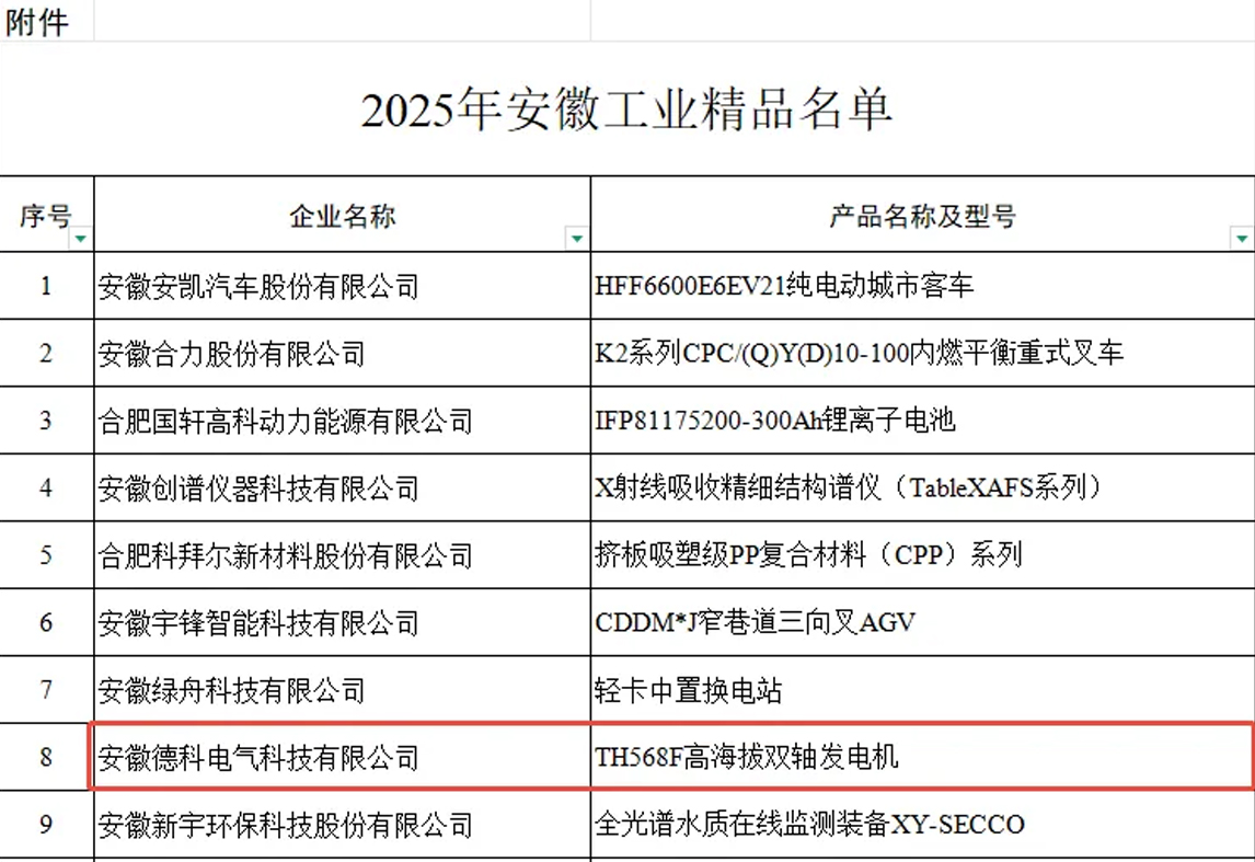 捷报传来!日前,安徽省工业和信息化厅正式发布2025年《安徽工业精品》名单,776net必赢官网电气TH568F高海拔双轴发电机凭借领先的技术性能与卓越的产品品质,成功入选,荣膺此项省级权威荣誉。