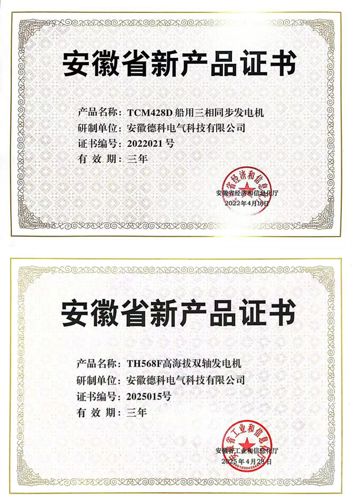 2025年5月,776net必赢官网电气自主研发的TCU468G陆用六极自励磁发电机与TH568F高海拔双轴发电机,凭借领先技术优势,双双通过权威评审,成功入选《2025年第一批安徽省新产品认定名单》。