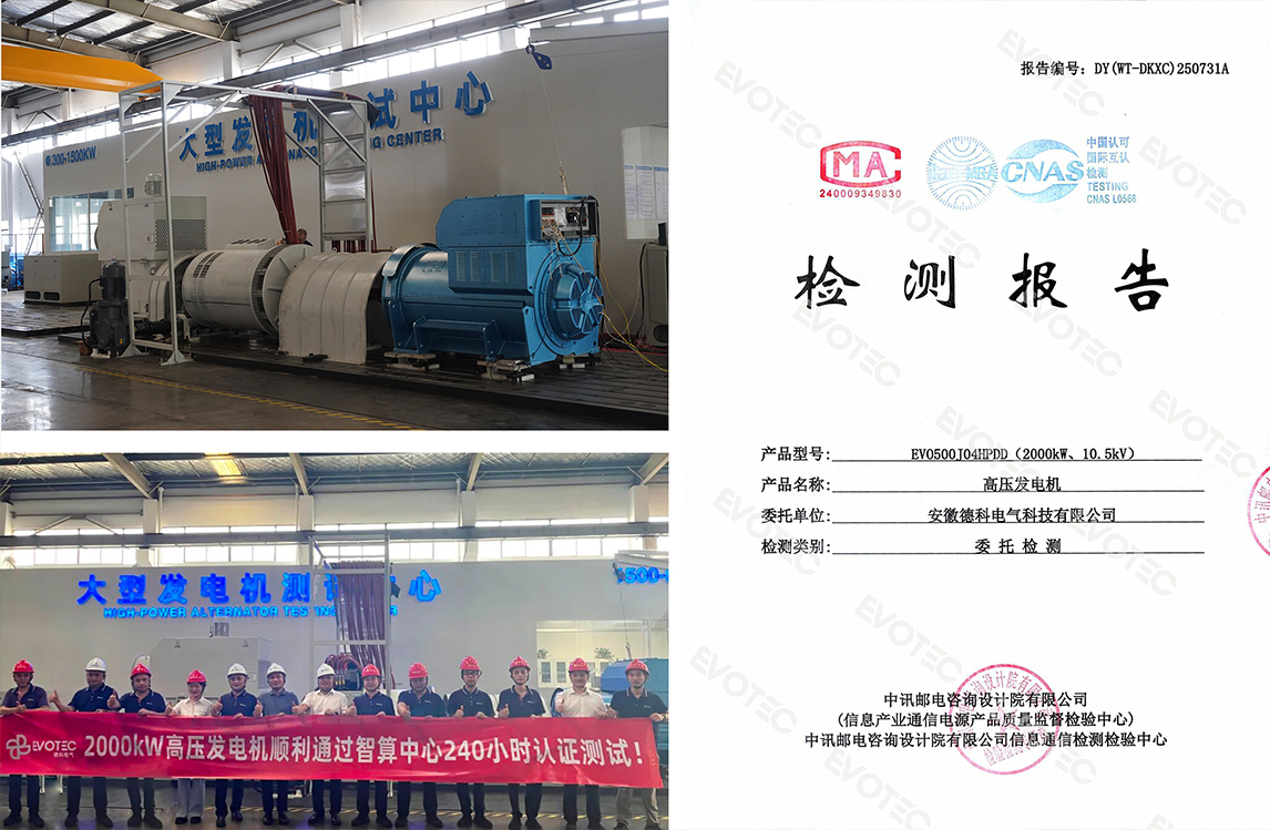 2025年8月,776net必赢官网2000kW高压发电机在近40℃高温环境下,接受了10天10夜长达240小时不间断满负荷运行的严苛考验,并随后主动进行3小时超负荷测试,全程各项性能指标稳定卓越,顺利通过。